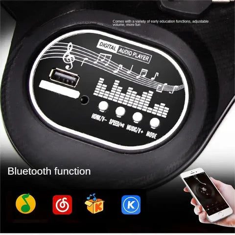 - Super size, real car key, separate light switch, wheel light, Early education, Story, music, USB, MP3 jack, LED Lights, Bluetooth.
